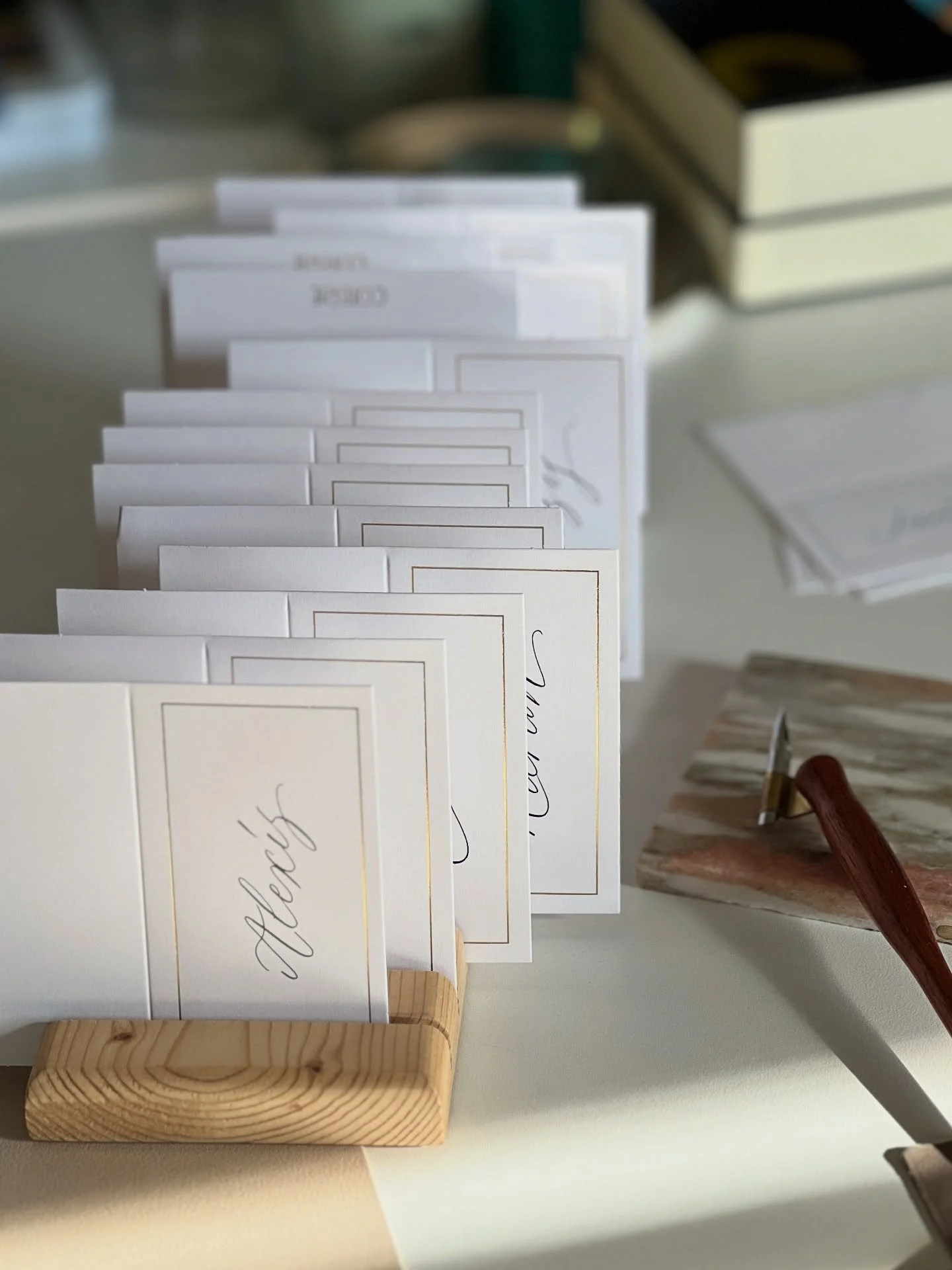 • I specialize in hand-lettering place cards for weddings, dinners, events, and brands in fashion, beauty, and entertainment. Whether it’s for an intimate dinner, a product launch, or a special celebration, I create custom designs that add elegance and sophistication to every occasion. My handcrafted calligraphy ensures your place cards leave a lasting impression.