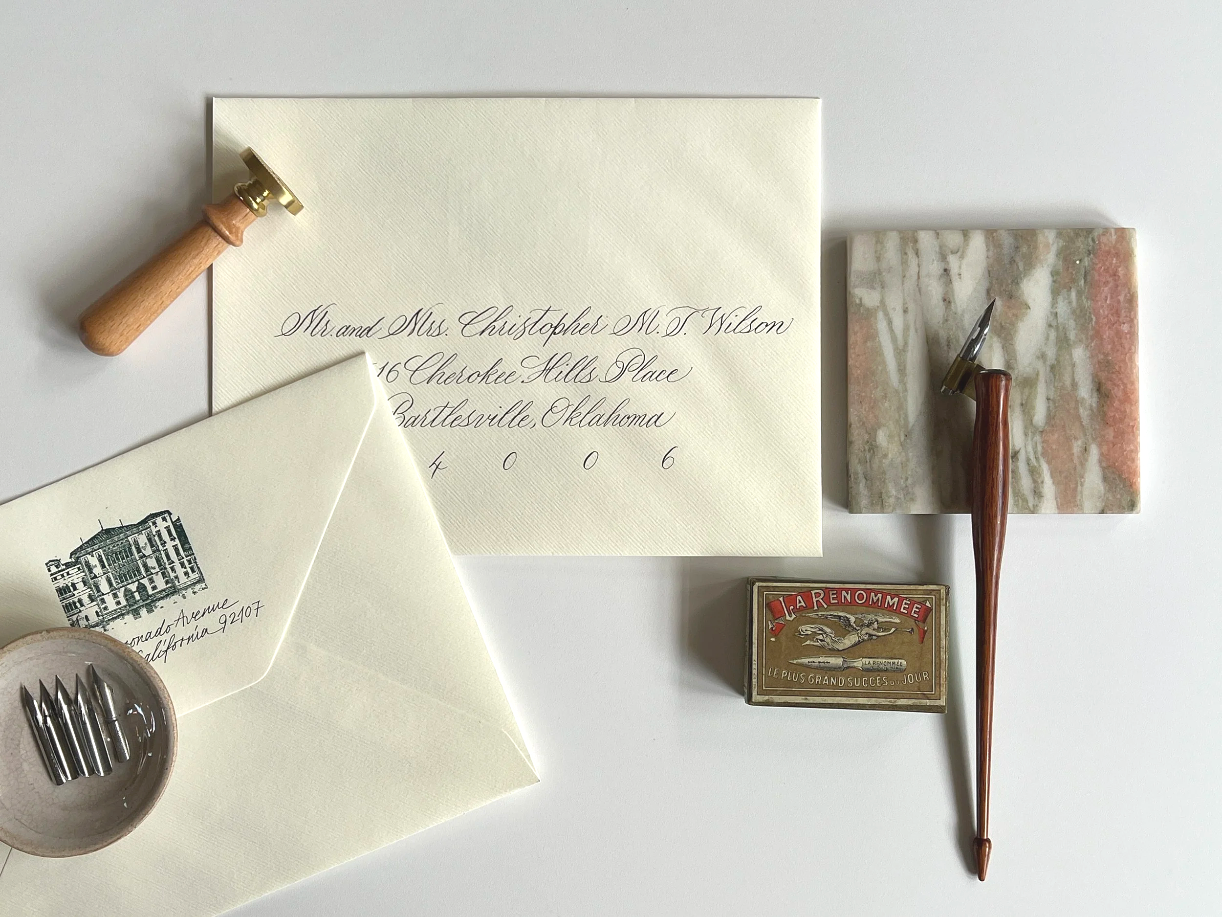Luxury wedding and event invitation addressing services in Los Angeles featuring hand-lettered envelopes and bespoke calligraphy.
